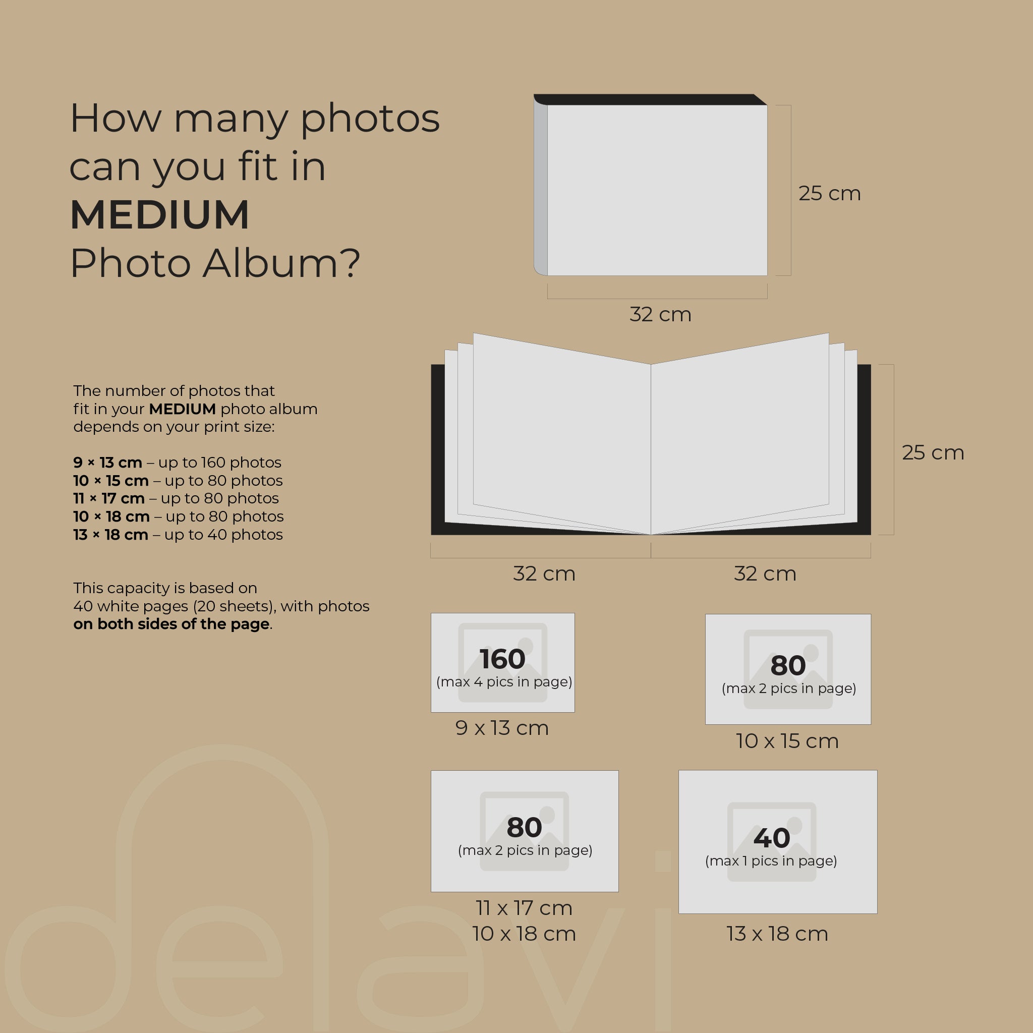 We made this product for those who appreciate high quality in various areas of life. This photo album is available in 2 sizes medium 12.6" x 9.8" / 32 x 25 cm and large 15.7" x 12.2" / 40 x 31 cm. These sizes are approximately equivalent to A4 and A3, respectively. Each album contains 40 pages (20 sheets). The number of pages can be increased by 10 making a total number of 60 pages (30 sheets). Photos can be securely fixed in place with your choice of adhesive, double sided photo stickers or photo corners. The textured paper of the photo album makes it easy to write in pen or pencil and to add stickers. Be your own artist and make notes next to your photos for a unique touch. Preserve your memories in style.